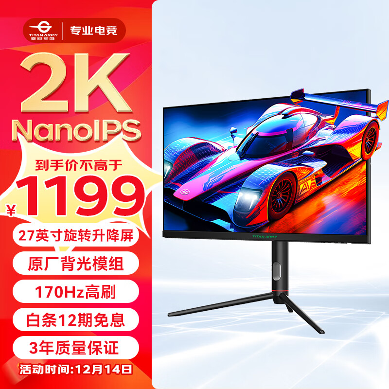 泰坦军团 27英寸 NanoIPS 2K 170Hz高刷 10bit HDR技术 原厂模组电竞显示器 升降旋转 1ms GTG电脑屏幕 P27GN价格:1699.00元!