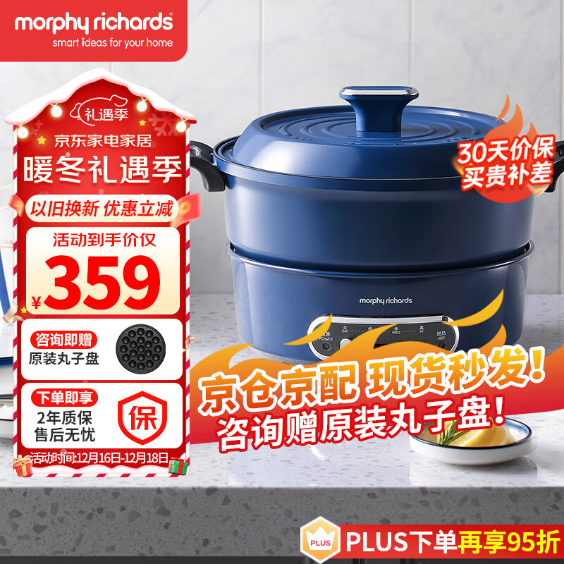 摩飞电器(Morphyrichards)电火锅 家用分体式电煮锅 烤涮一体多功能电炒锅电烧烤料理锅 3L电热火锅锅 MR9087地中海蓝价格:379.00元!