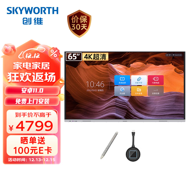 创维(Skyworth)65英寸会议平板一体机 电子白板 无线传屏投影 智能触摸屏电视【商用显示】65DSH5投屏器套装价格:4799.00元!