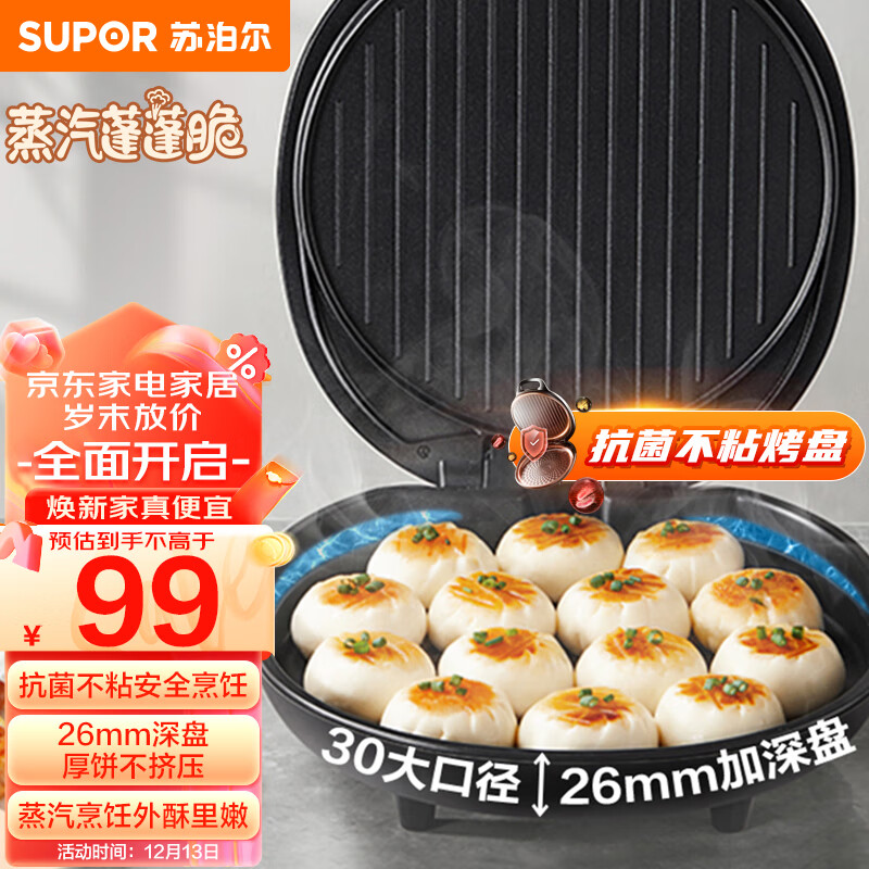 苏泊尔(SUPOR)电饼铛家用 电饼档 煎饼锅 煎烤机烙饼锅三明治机26mm加深 早餐机 升级蒸汽烤盘JJ30A648-Q价格:99.00元!