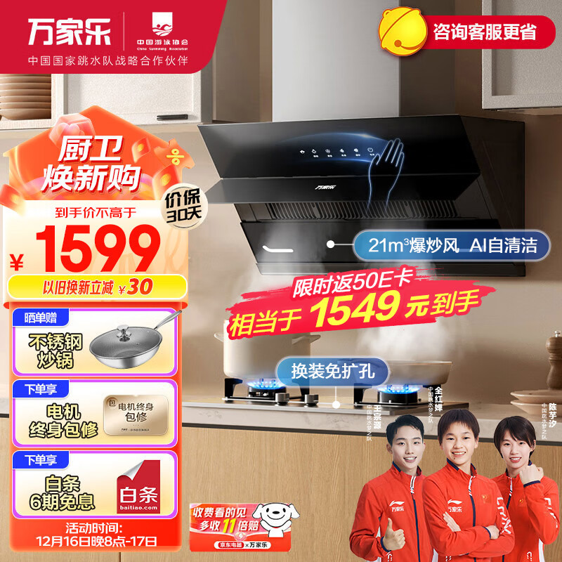 万家乐抽油烟机 侧吸式烟灶套装 21立方大吸力挥手自清洗 5.0kw不锈钢免扩孔燃气灶套装AJ4+AY4G天然气价格:1799.00元!