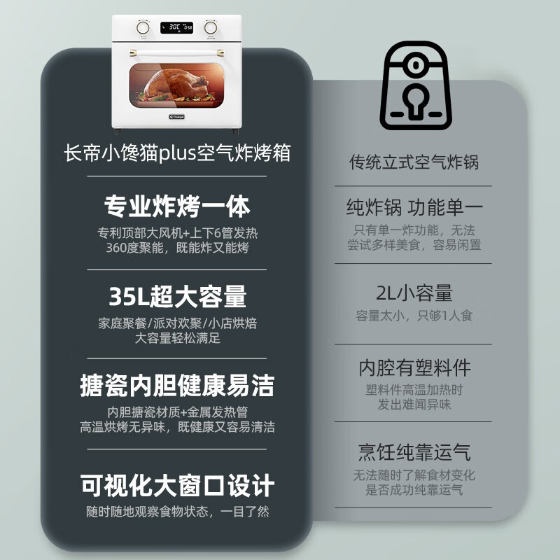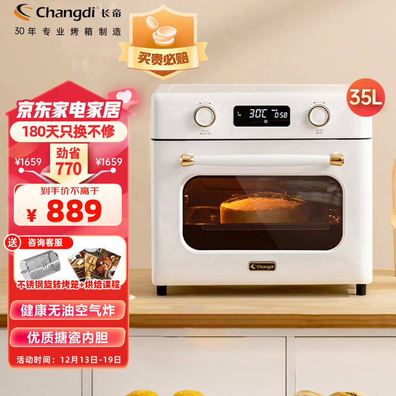 长帝(changdi)家用空气炸锅烤箱 35升大容量 电子精准控温 双层防爆门 智能菜单小馋猫plus价格:889.00元!