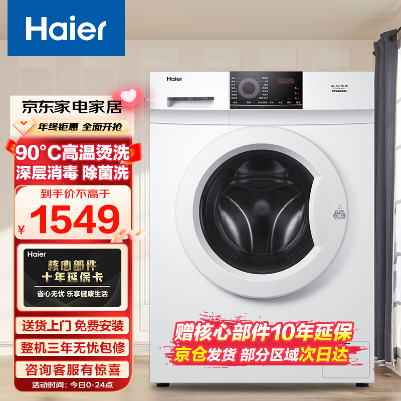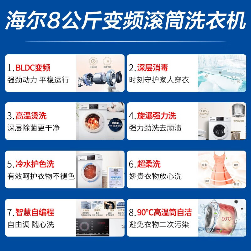 海尔(Haier)8KG全自动滚筒洗衣机家用大容量一级变频节能高温消毒杀菌洗筒自洁洗脱一体EG80B08W[家电]价格:1549.00元!