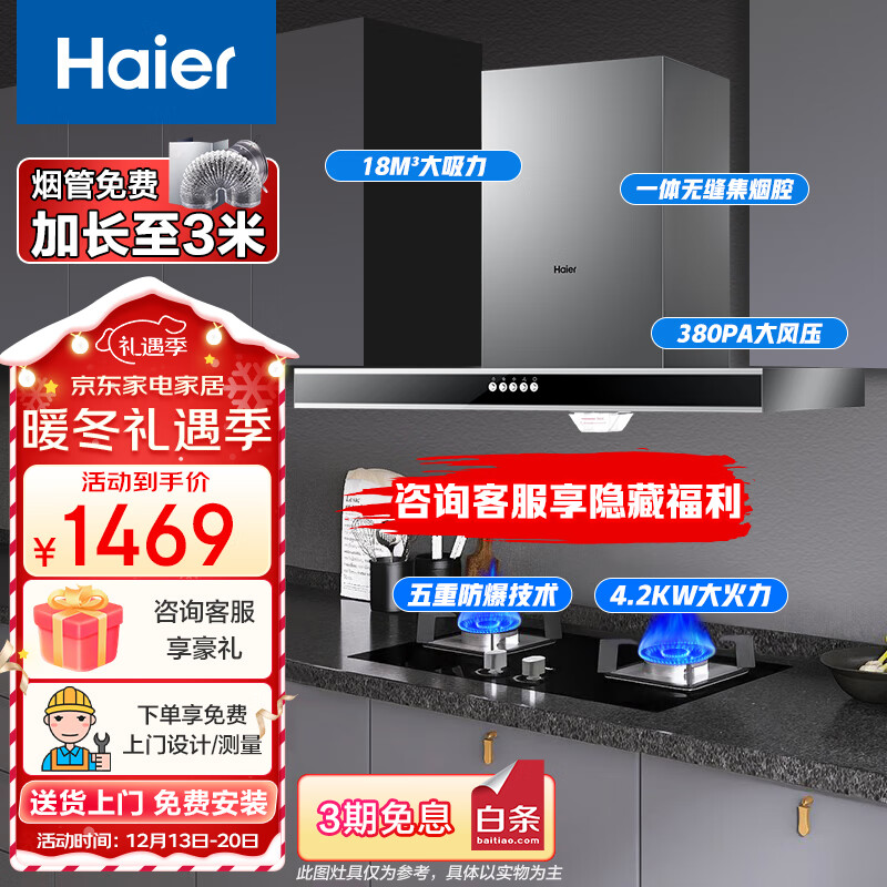 海尔(Haier)抽油烟机燃气灶套装 欧式顶吸一级能效 18m3大吸力吸油烟机家用 E900T6V烟灶套装4.2KW灶[家电]价格:1469.00元!