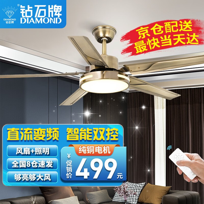 钻石牌(DIAMOND) 风扇灯吊扇大风力客厅餐厅带灯吊扇中式复古简约吊扇灯LED照明遥控一体风扇 5310古铜色吊扇灯/变频双控(52寸)价格:629.00元!