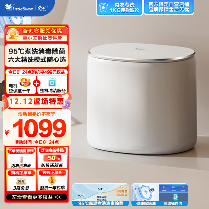 小天鹅(LittleSwan)1KG迷你洗衣机全自动 内衣裤洗衣机 小型迷你婴儿洗衣机 健康除螨洗 TNB10V0WE 健康桶自洁价格:1099.00元!