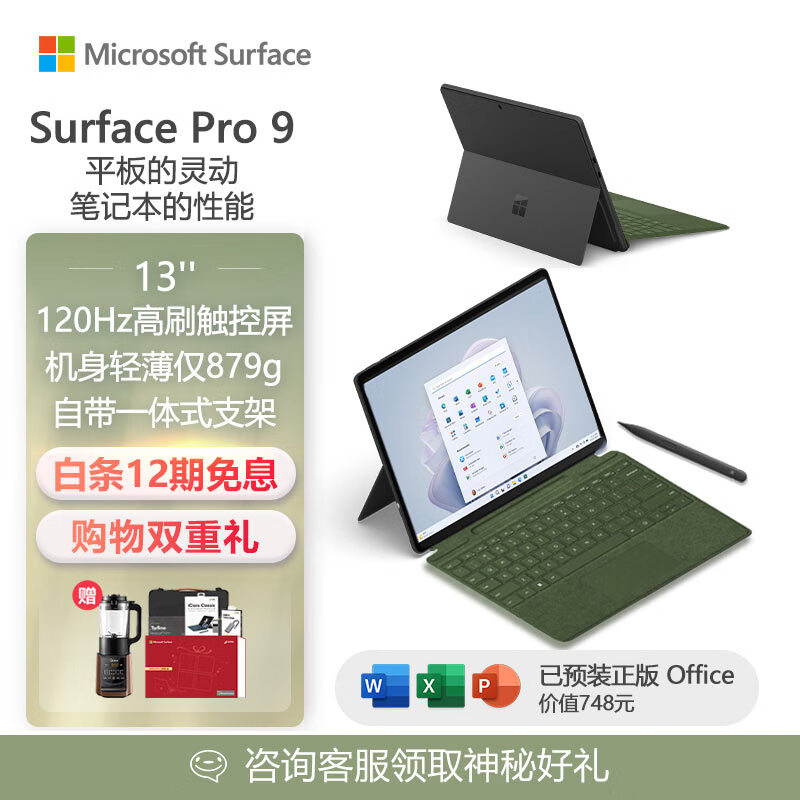 微软Surface Pro 9 石墨灰+森野绿带触控笔键盘盖 i7 16G+512G 二合一平板电脑 13英寸120Hz触控屏 轻薄本价格:16688.00元!
