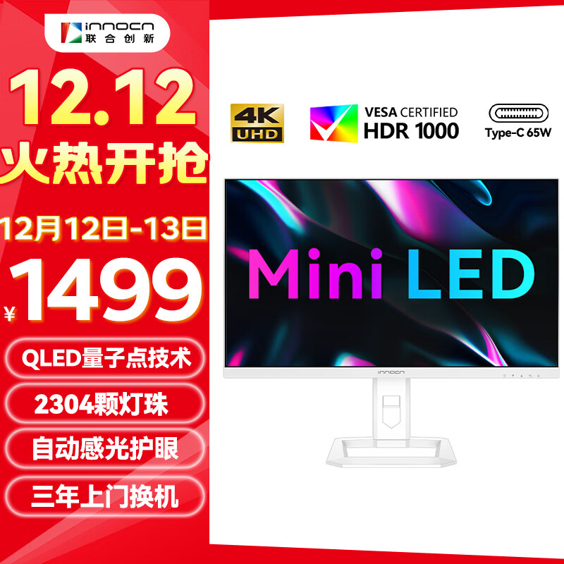 联合创新(INNOCN)27英寸4K MiniLED显示器 量子点 HDR1000 Type-C65W旋转升降 设计办公电脑显示屏27M2U-D价格:2499.00元!