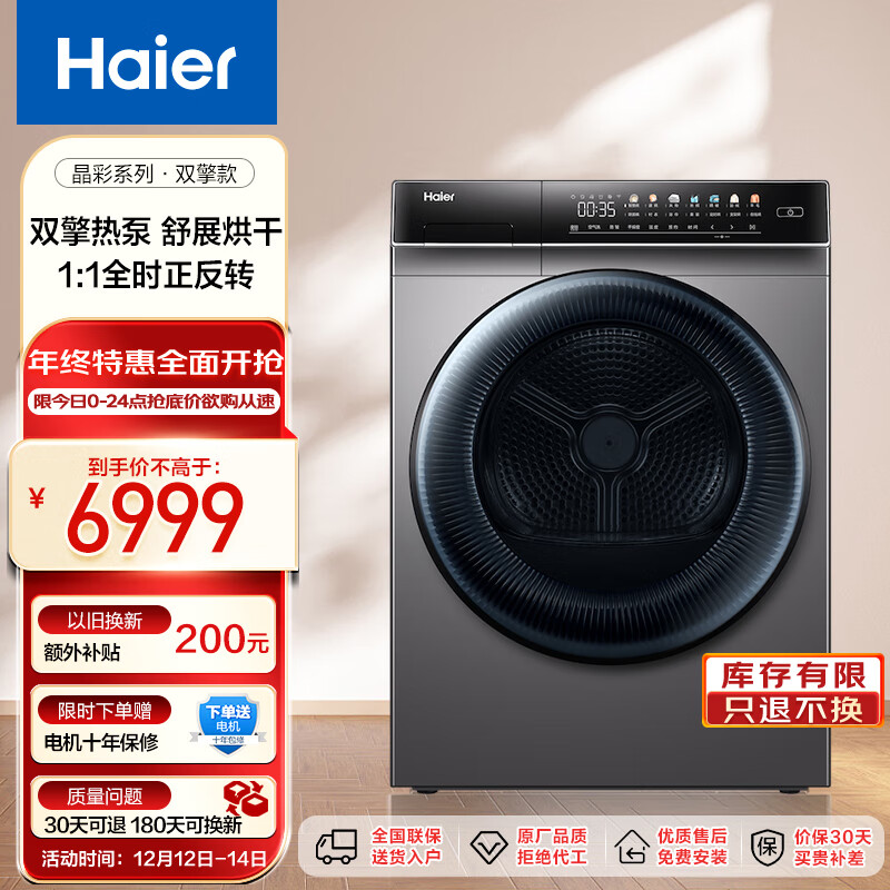 海尔(Haier)晶彩烘干机家用 10公斤双擎热泵干衣机 空净过滤系统 除菌螨 EHGS100MATE7SU1 以旧换新价格:6999.00元!