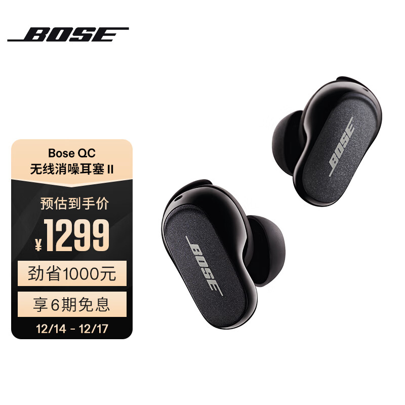 Bose QC消噪耳塞II-黑色 大鲨二代 真无线入耳式蓝牙主动降噪耳机耳麦 智能音场调校 毫秒级精准消噪价格:1399.00元!