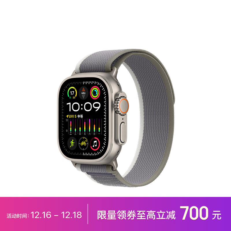 Apple Watch Ultra2 智能手表GPS+蜂窝款49毫米钛金属表壳绿配灰色野径回环式表带M/L eSIM健康手表MRFP3CH/A价格:6499.00元!