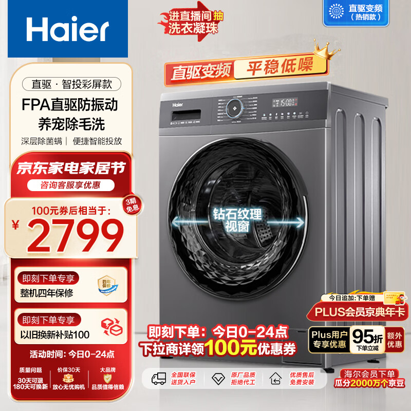 海尔(Haier)滚筒洗衣机全自动 直驱单洗旗舰款 10公斤大容量 直驱变频防震动 智能投放 以旧换新 EG100MATE71S价格:2899.00元!