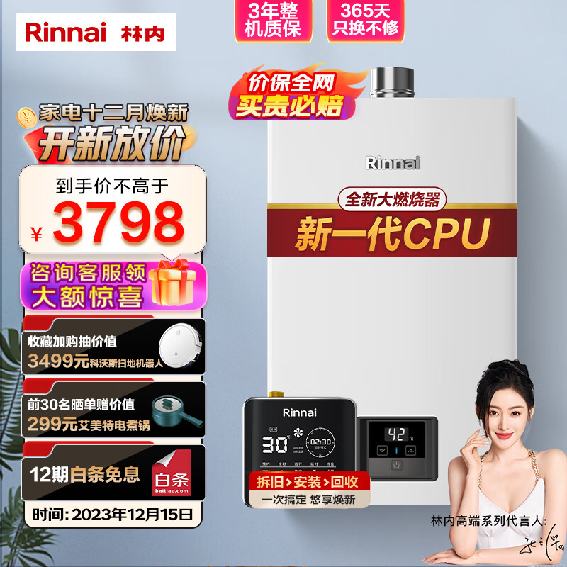 林内(Rinnai)13升燃气热水器零冷水两件套智慧恒温全新升级CPU黄金窄比恒温系列RUS-13GD31+SG(JSQ26-GD31)价格:3898.00元!