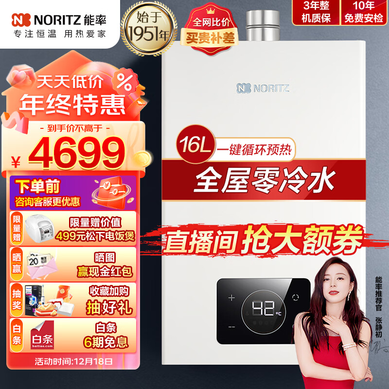 能率(NORITZ)零冷水燃气热水器16升 中途开关“0”冷水 降噪恒温GQ-16E5FEXQ(JSQ31-E5Q)天然气价格:4699.00元!