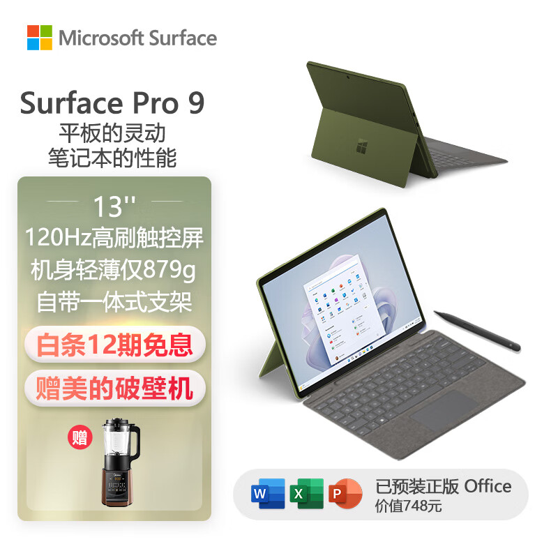 微软Surface Pro 9 森野绿+亮铂金带触控笔键盘盖 i5 16G+256G 二合一平板电脑 13英寸120Hz触控屏 办公平板价格:12488.00元!