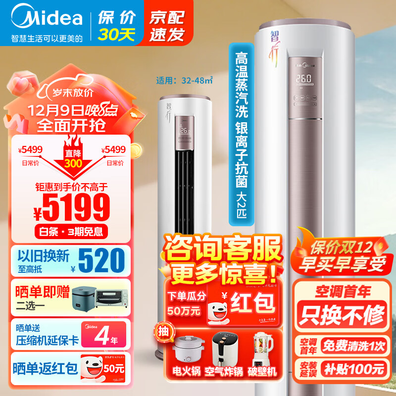 美的(Midea)2匹变频柜机 新一级能效 变频冷暖 立式空调柜机 智能家电 自清洁 智行 KFR-51LW/BDN8Y-YH200(1)A价格:5199.00元!