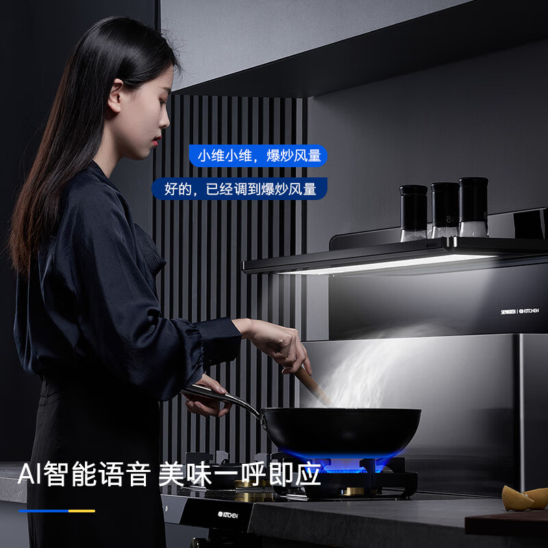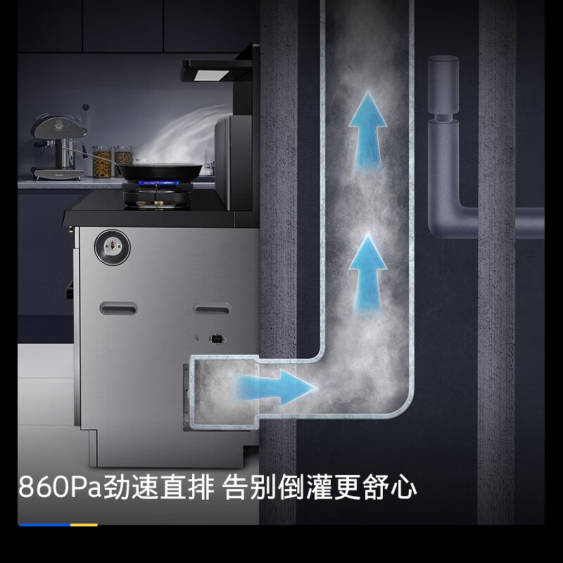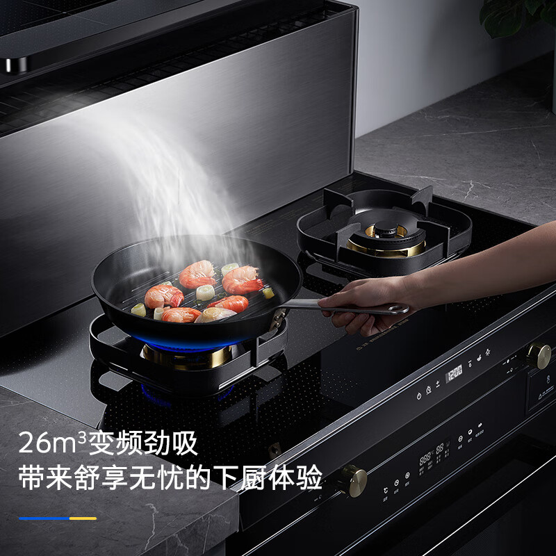 4、火力猛炒菜快受热均匀!带的抽油烟机吸力大,调节方便,声音轻柔,效果很好不跑烟!外观和厨房很搭配,简洁大气很现代化!非常满意!