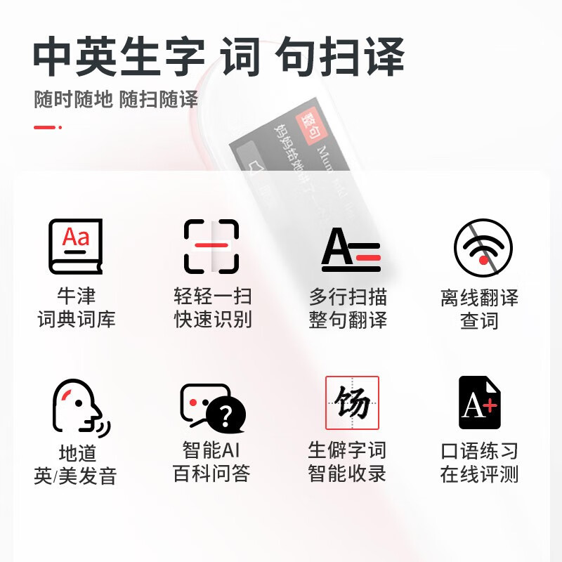 1、年前就收藏了这款词典扫读笔,冲着扫读笔内含正版牛津词典买来试试,到货后孩子拆开很喜欢,词典笔扫描精准,不管是汉字还是英语轻轻一扫就能翻译出来,不会的地方就用词典扫读笔,家长终于解放了,不用一个一个翻手机翻字典