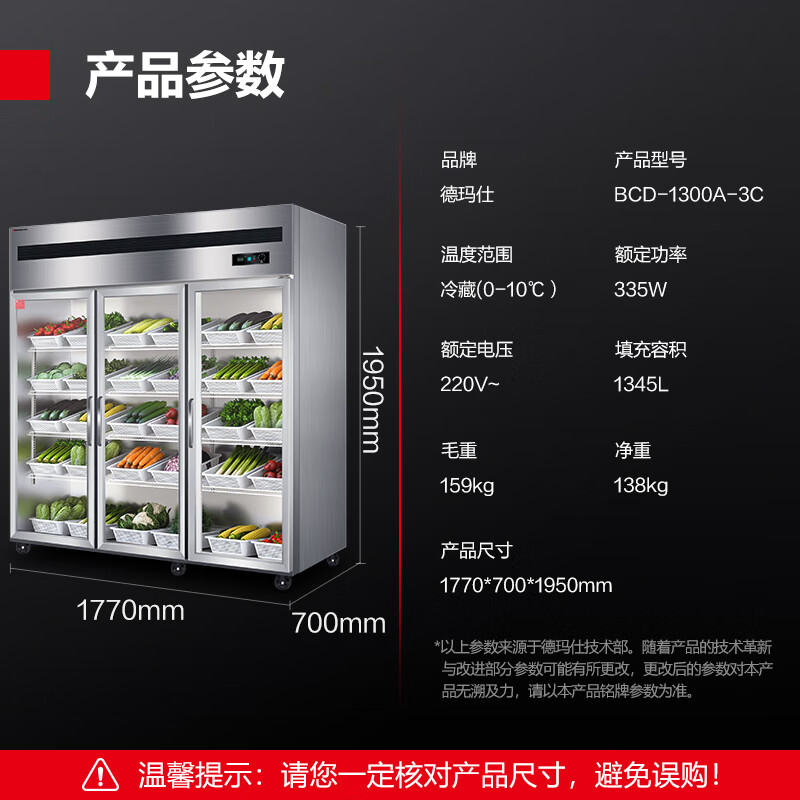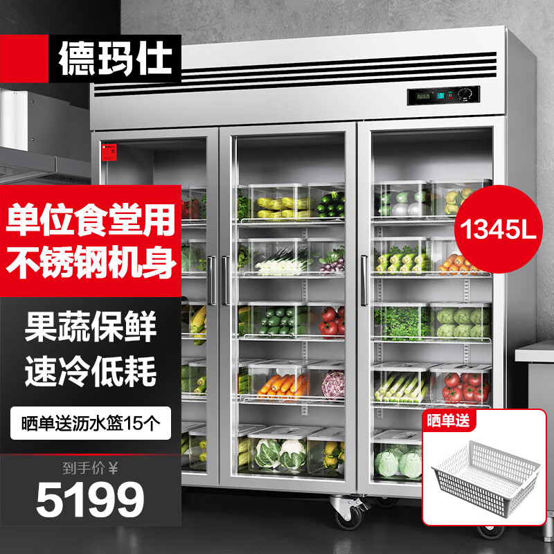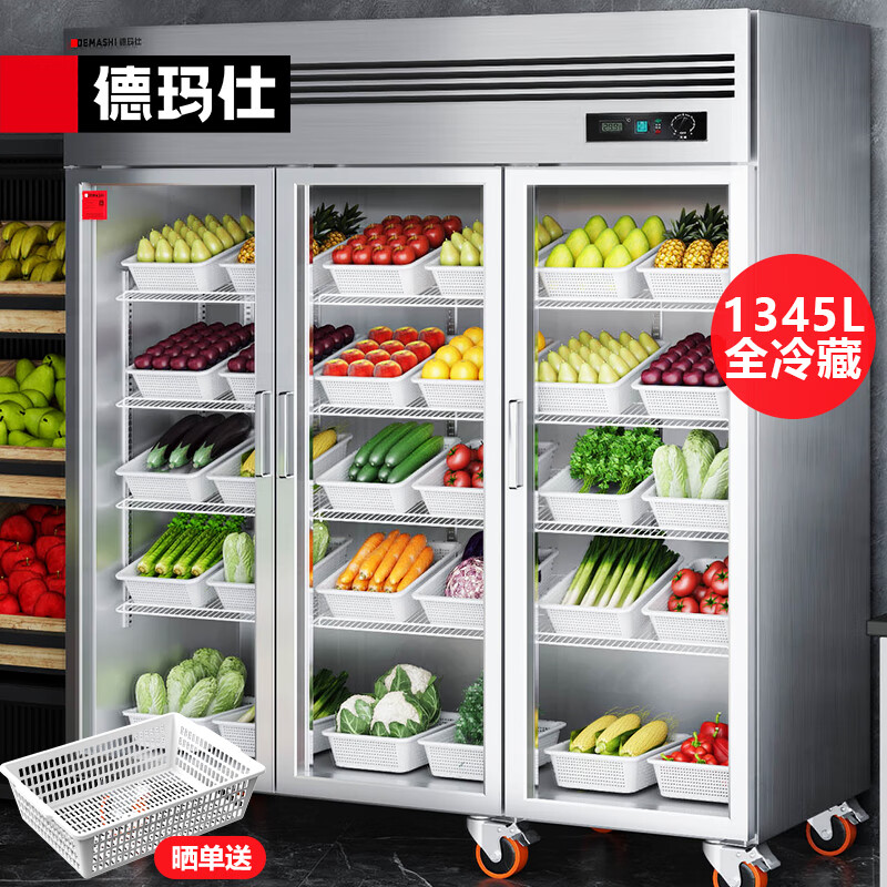 德玛仕(DEMASHI)水果蔬菜商用保鲜柜展示柜 大容量玻璃展示冷藏冰柜 三门立式厨房冰箱 不锈钢款BCD-1300A-3C价格:5199.00元!