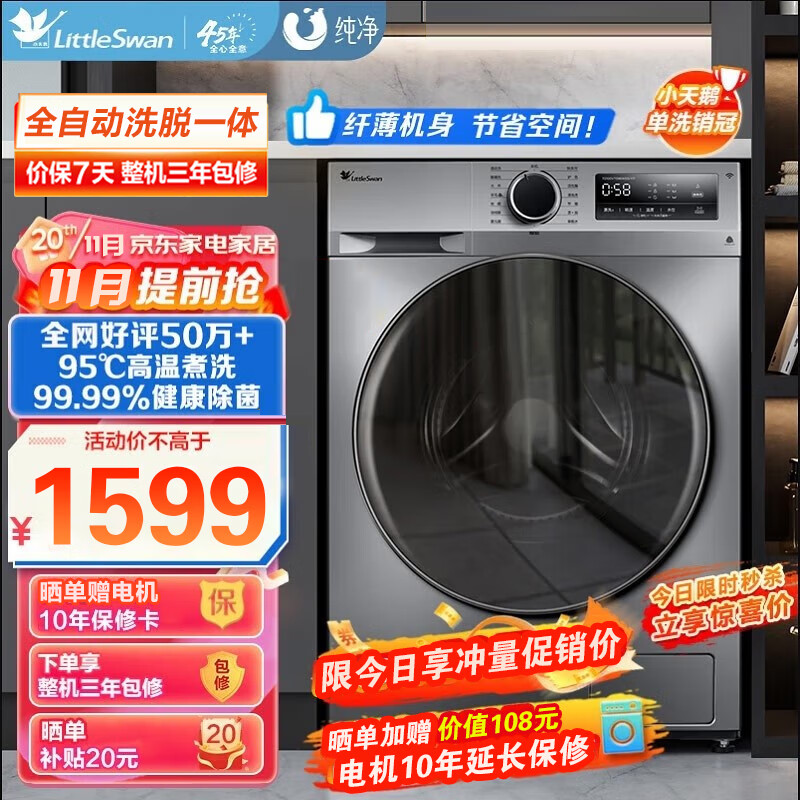 小天鹅(LittleSwan)10公斤滚筒洗衣机全自动大容量 深层除菌净螨 BLDC变频电机TG096-Y1T价格:1499.00元!