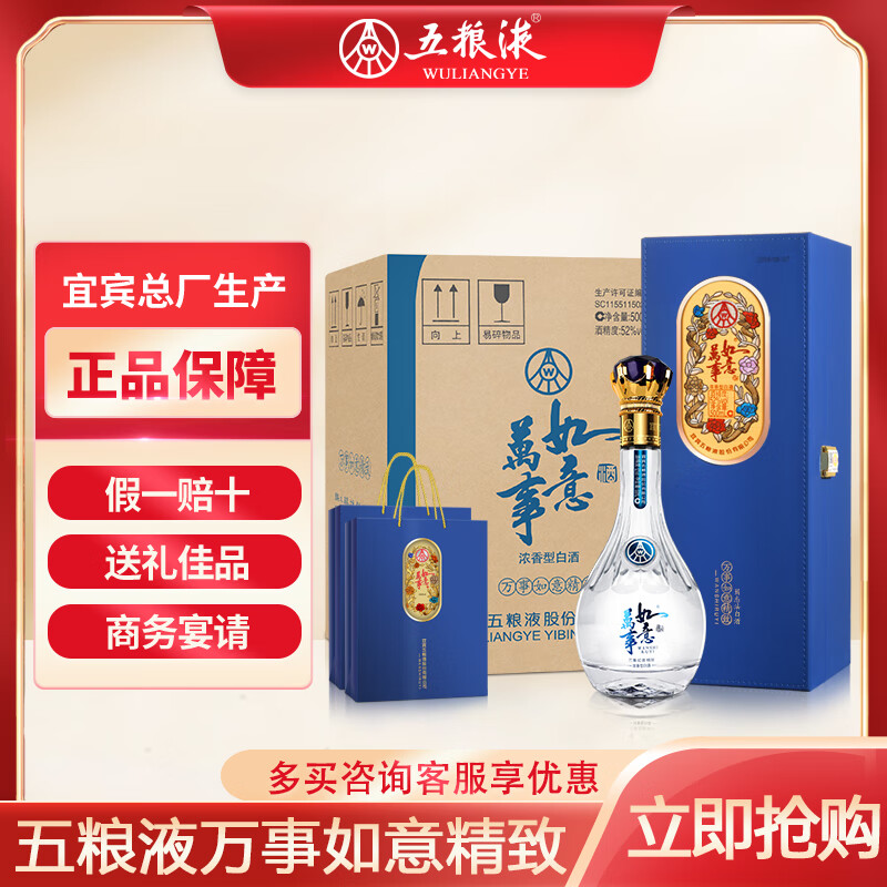 五粮液 送礼佳品 万事如意精致皮盒52度500ml*4瓶固态法浓香型白酒价格:1252.00元!