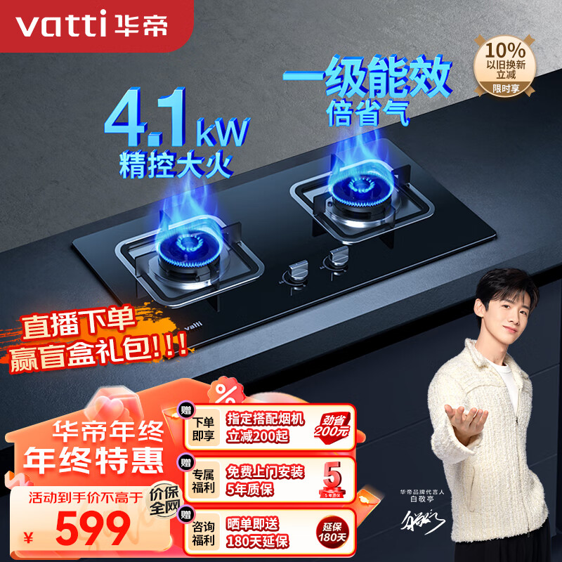 华帝(VATTI)燃气灶家用台式嵌入式 4.1kW钢化玻璃面板台嵌两用 双灶台灶具JZT-i10039B(天然气)价格:595.00元!