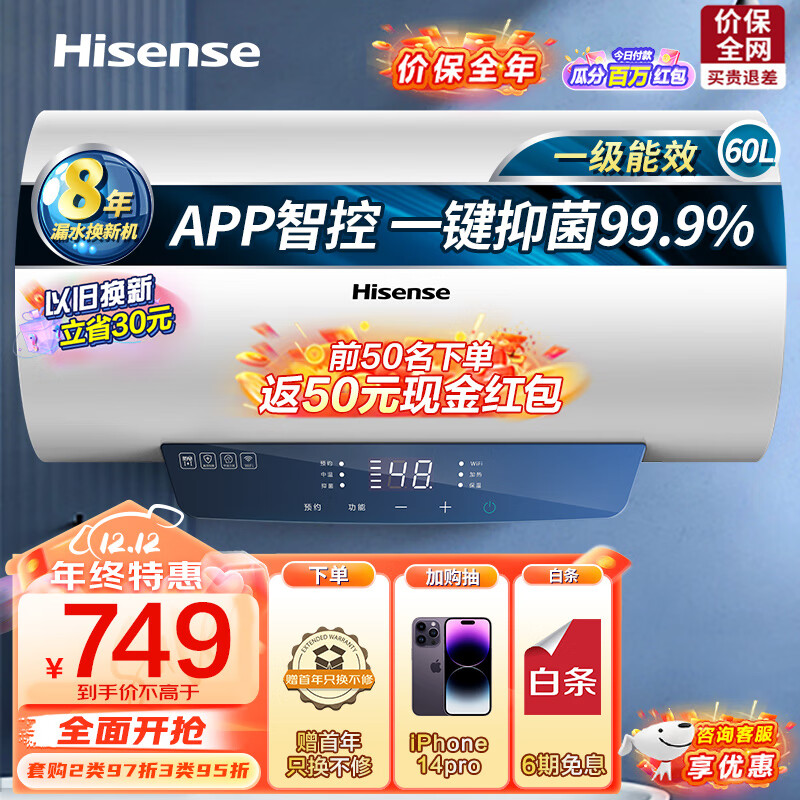 海信(Hisense)60升家用电热水器 2100W速热5.5倍增容内胆自清洁 WIFI一级能效多重防护DC60-W3210i价格:849.00元!
