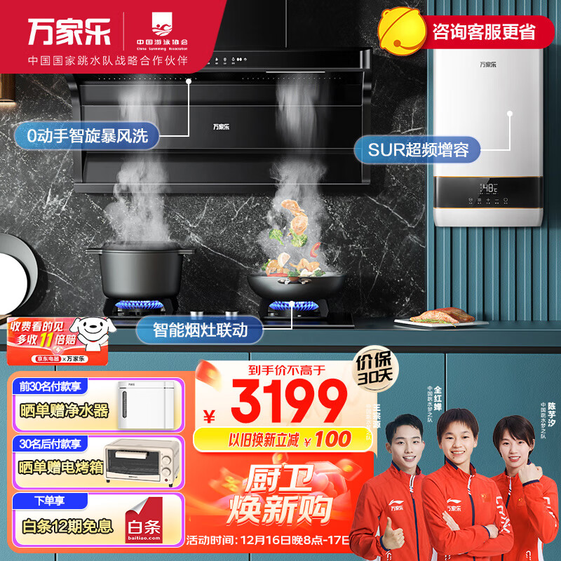 万家乐 抽油烟机 顶侧双吸油烟机 23m3/min烟灶热三件套四季随温感16L热水器AK6+KV063B+16D5S天然气价格:3399.00元!