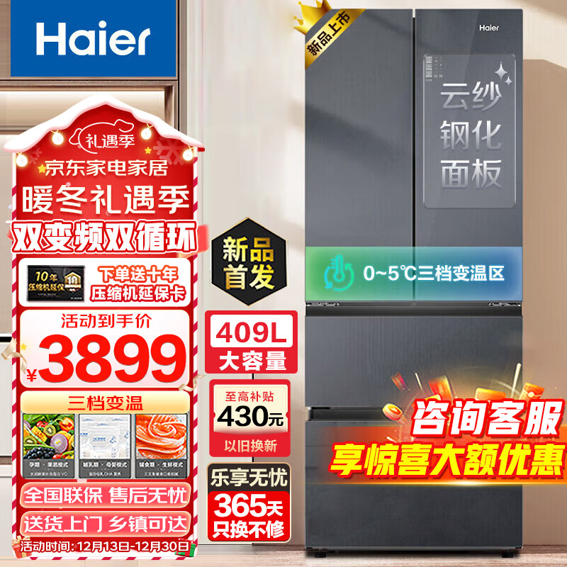 海尔(Haier)409升法式多门家用冰箱 一级能效双变频风冷无霜黑金净味四开门电冰箱BCD-409WLHFD7DSR价格:3899.00元!