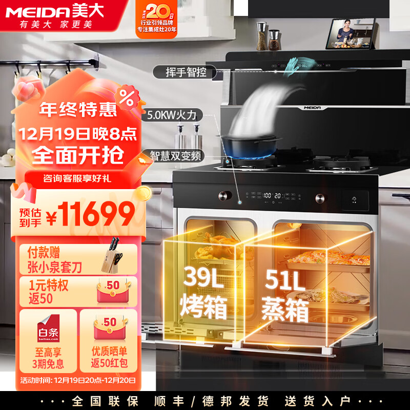 美大(Meida)集成灶V9-MAX蒸烤一体升级独立蒸烤款 左烤炸右蒸炖款家用集成灶燃气灶(液化气)价格:12999.00元!