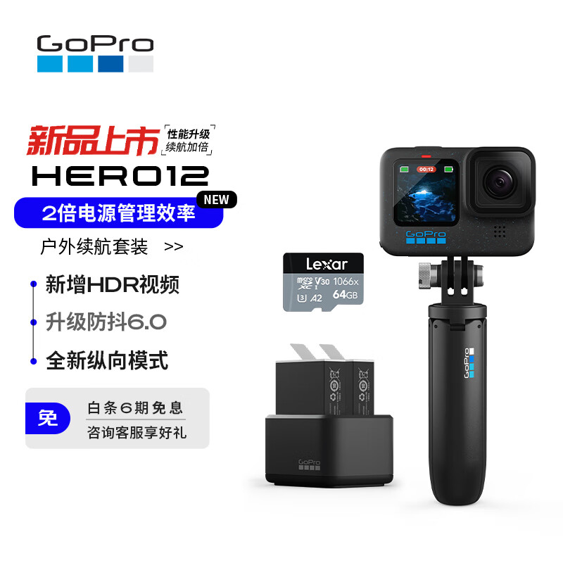 GoPro HERO12 Black运动相机 潜水防抖摄像机 vlog数码防水相机 户外续航套餐【shorty+增强双充+64G内存卡】价格:3998.00元!