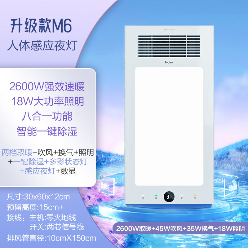 海尔风暖浴霸2600W大功率双电机触控开关感应夜灯浴室暖风机吊顶M6价格:599.00元!