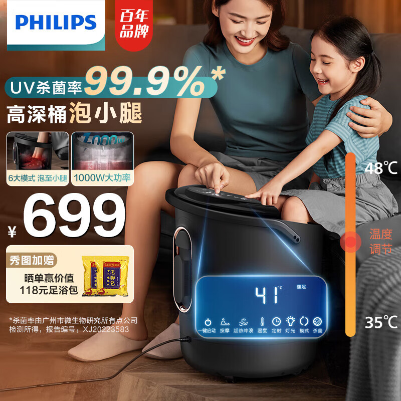 飞利浦(PHILIPS)泡脚桶按摩足浴盆全自动按摩洗脚盆家用泡脚盆足浴桶电动加热洗脚桶实用圣诞生日礼物送父母亲长辈 【全新升级·智能杀菌】六大模式-5303F价格:778.99元!