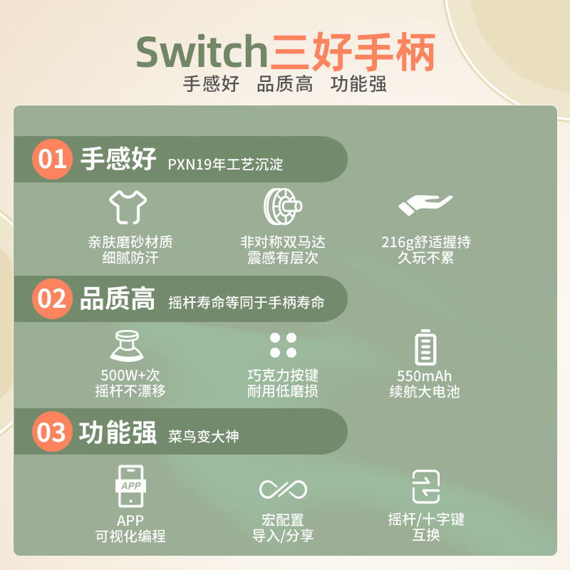 1、这颜色比想象中好看,霍尔版这个价格超值。新手柄按键回位干净利落,连接switch也够快。振动强劲但有点混的感觉,还好我对振动要求不高。