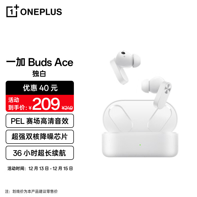 一加Buds Ace 真无线主动降噪蓝牙耳机 入耳式音乐运动电竞游戏耳机 通用oppo小米苹果华为手机 独白价格:209.00元!