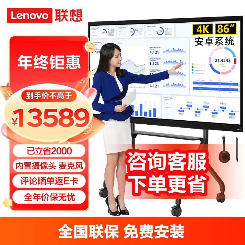 联想thinkplus会议平板一体机86英寸电子白板视频会议电视商用触摸显示屏BM86tr+笔+投屏器+移动支架价格:13589.00元!