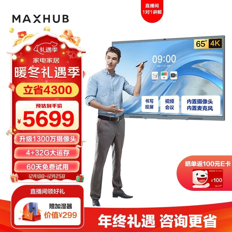 maxhub会议平板V6新锐65英寸 教学视频会议一体机 会议投屏电视触摸智慧屏E65商用显示 企业智能办公价格:5699.00元!