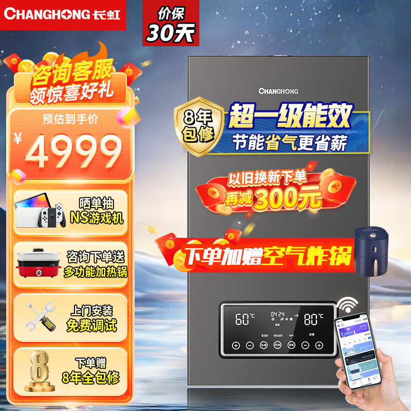 长虹(CHANGHONG)燃气壁挂炉家用供暖淋浴一级能效冷凝式节能省气APP智控暖气片地暖恒温LL1PBD24-C6价格:4999.00元!