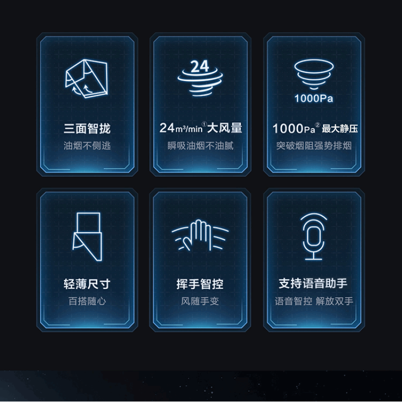 5、外观不错,挺有科技感。挥手开机好评。吸力很大,几乎没有油烟,能满足日常使用需求。