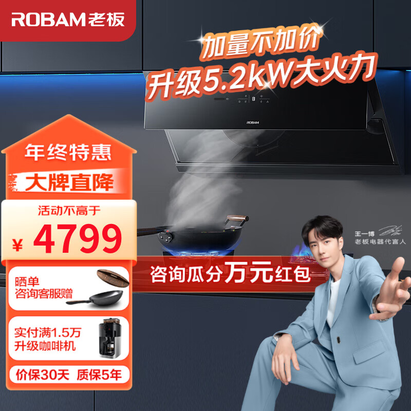 老板(Robam)油烟机28X6ST变频油烟机24风量抽油烟机【王一博同款】低噪音挥手感应智能语音控制抽油油烟机 搭配5.2kW火力灶具57B0X套装 天然气 探索家系列价格:4799.00元!