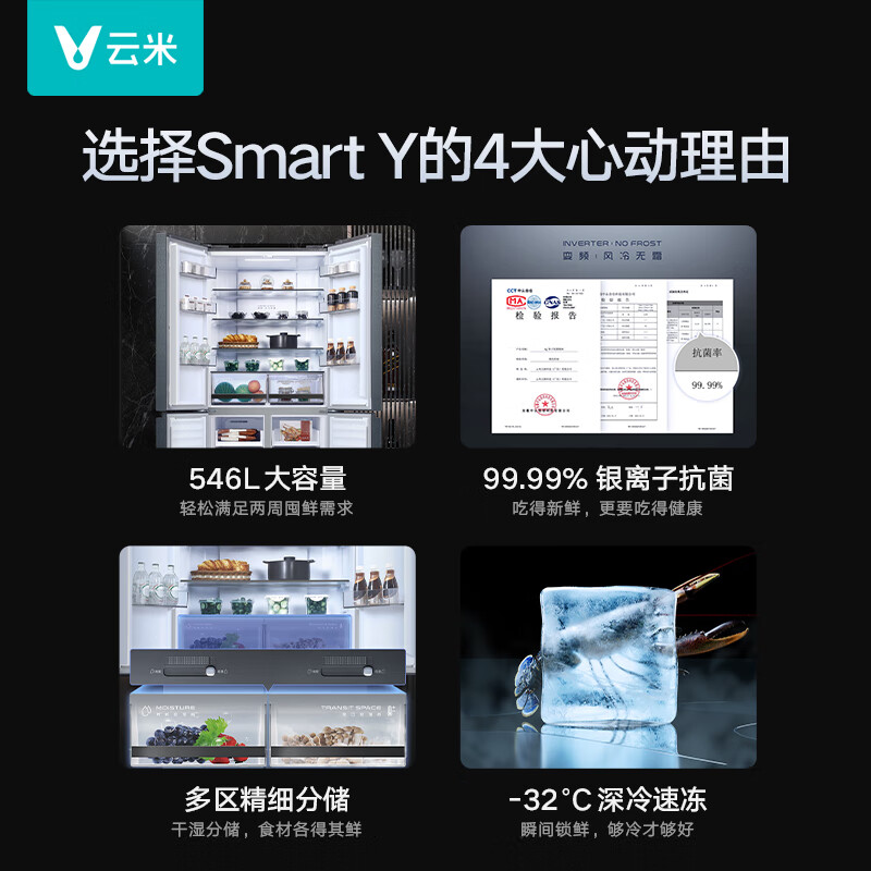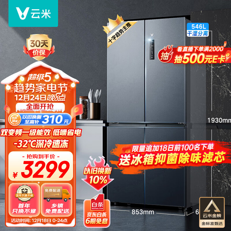 云米546升变频一级能效十字双开门云晶灰大容量家用冰箱智能家电风冷无霜冰箱BCD-546WMSAZ04深冷速冻价格:3299.00元!