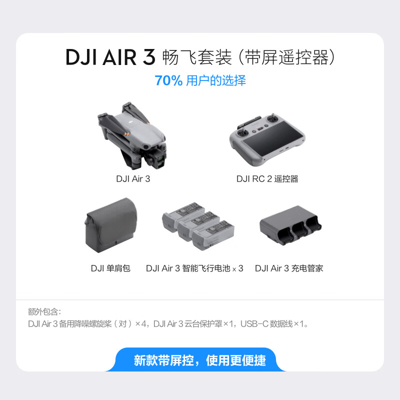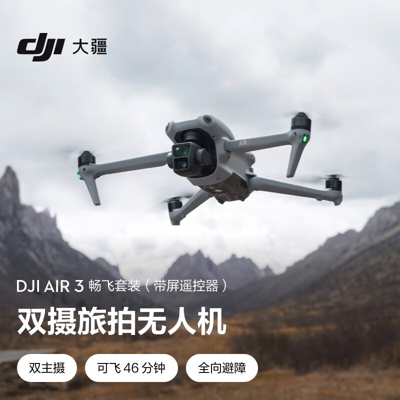 大疆 DJI Air 3 畅飞套装(带屏遥控器) 航拍无人机 中长焦广角双摄旅拍 高清专业航拍遥控飞机价格:9688.00元!