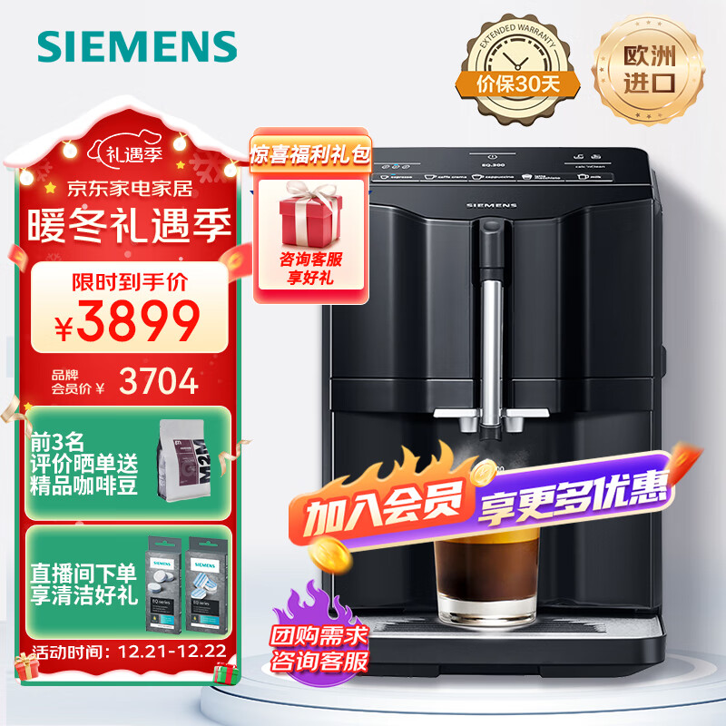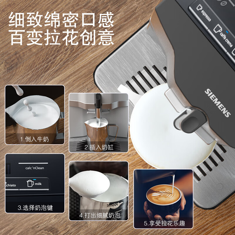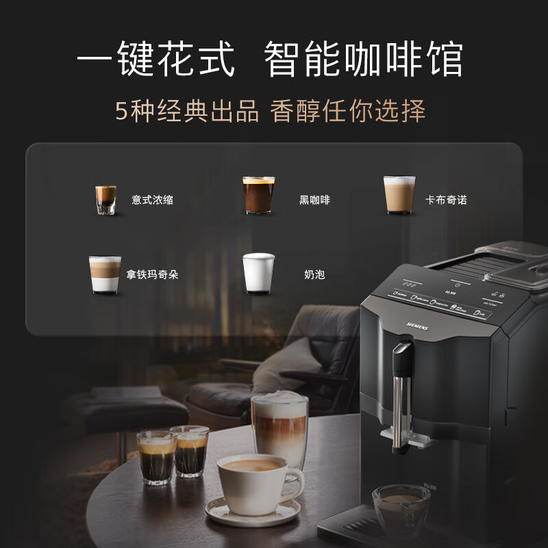 西门子【一键花式奶咖】全自动咖啡机意式家用研磨一体机15Bar蒸汽奶泡机5种饮品智能清洁TI35A809CN价格:3899.00元!