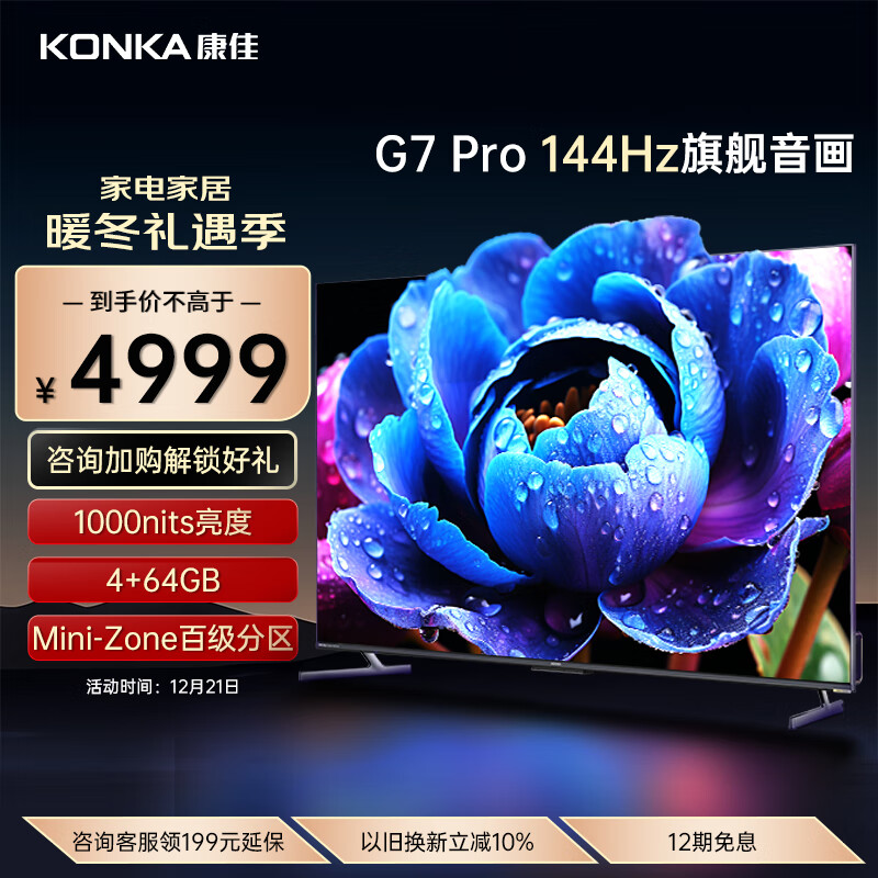 康佳电视 75G7 PRO 75英寸 百级分区 144Hz游戏电视 4+64GB 4K超清屏智能液晶平板电视机以旧换新价格:4999.00元!