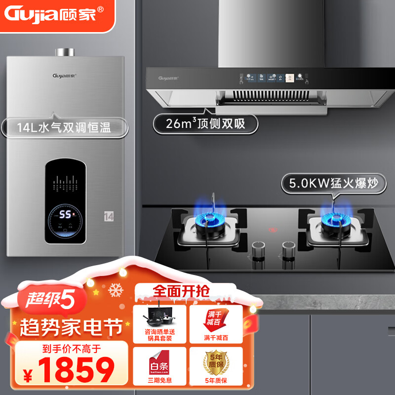 顾家(Gujia)抽油烟机燃气灶套装脱排抽烟机家用大吸力欧式吸油烟机厨房顶吸式油烟机套装三件套 【旗舰三件套】烟灶+14L燃热水器(天然气)价格:2199.00元!