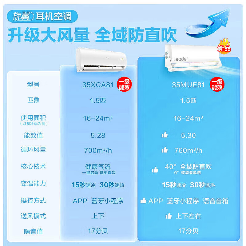 统帅(Leader)空调海尔空调出品 旋翼1.5匹防直吹挂机新一级能效 变频自清洁壁挂式空调旋翼变风急速变温35MUE81价格:2299.00元!