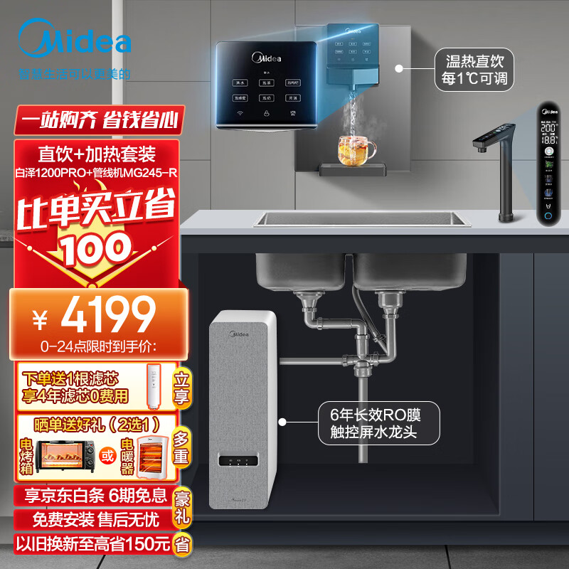美的(Midea)直饮加热净水器套装【白泽1200Gpro+管线机MG245-R(908A升级款)】厨下RO 家用即热一体净饮机价格:4199.00元!
