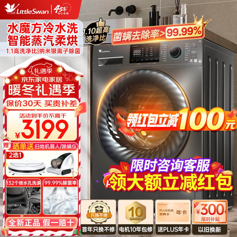 小天鹅(LittleSwan)全自动滚筒洗衣机洗烘一体机 10公斤家用一级能效变频868水魔方护型护色银离子除菌TD100V868WMADT价格:3199.00元!