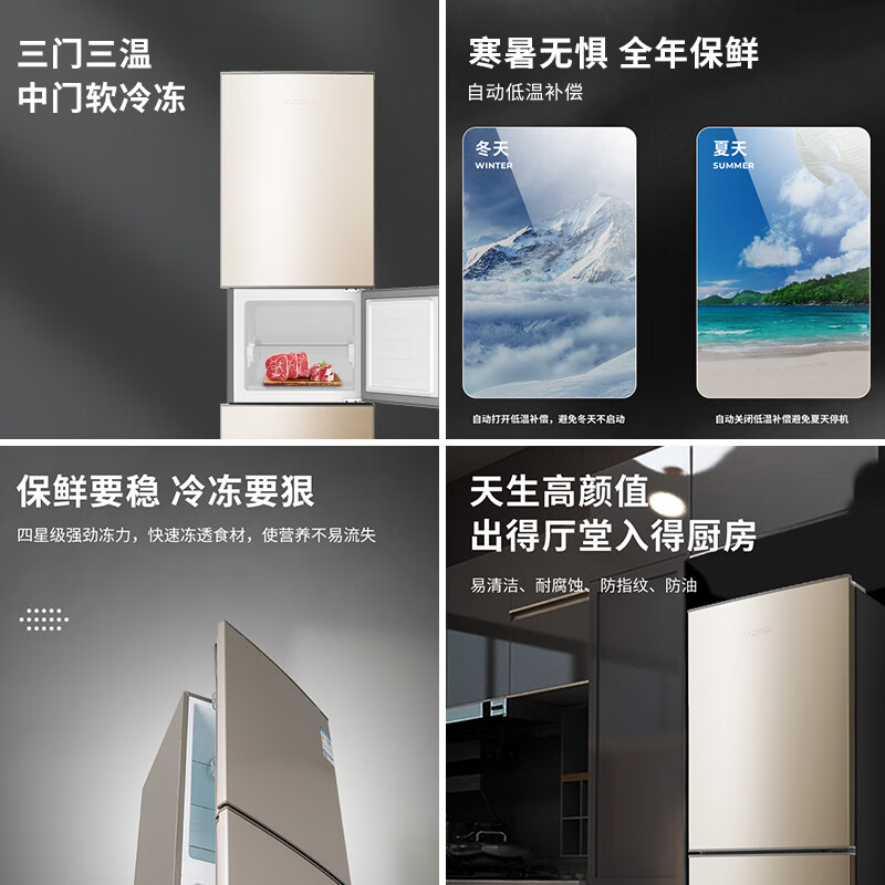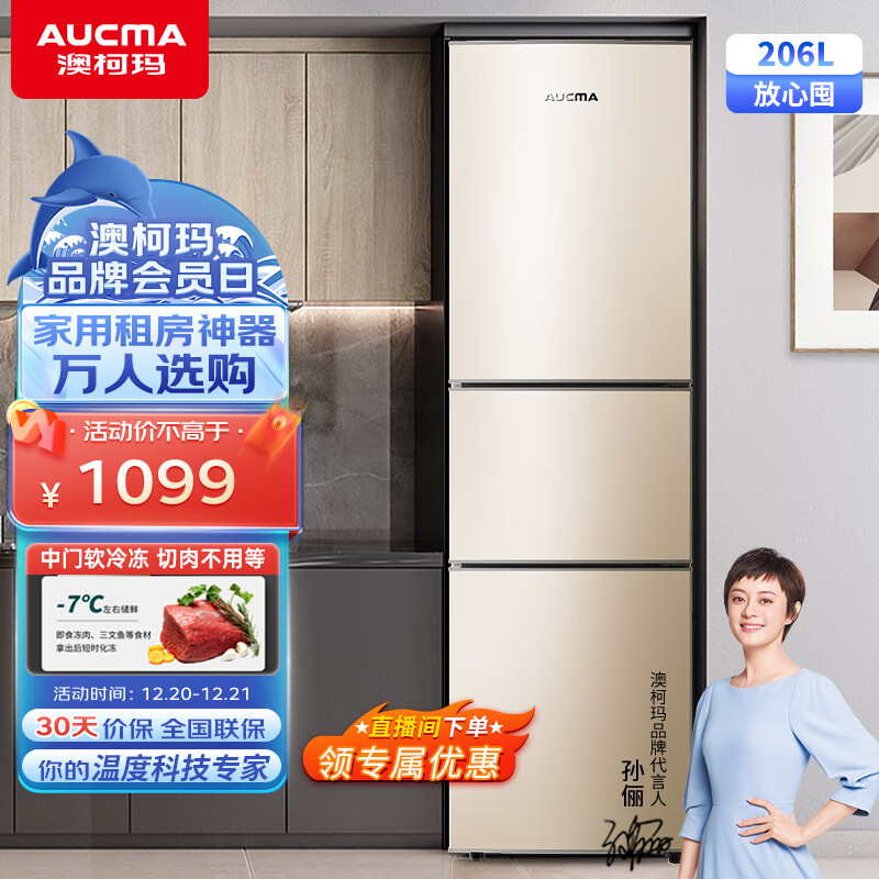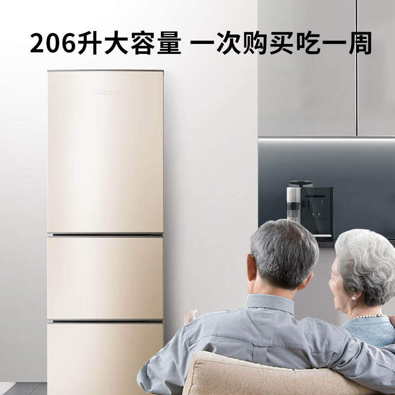 澳柯玛(AUCMA)冰箱三开门小冰箱家用租房用多门小型电冰箱节能低噪囤货小占地金色206升 以旧换新 BCD-206NE价格:1199.00元!