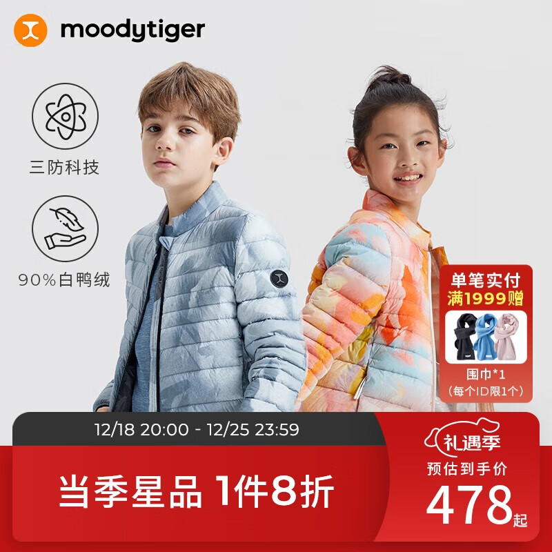 moodytiger儿童轻薄羽绒服23年秋冬季印花中性男女童三防保暖鸭绒服价格:598.00元!